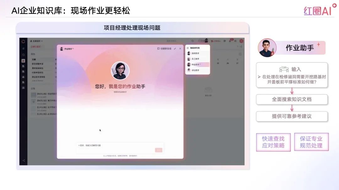 紅圈AI,以大模型+智能檢索技術為引擎,構建企業知識資產體系,實現“經驗即問即答”,推動企業從“人找知識”走向“知識找人”。