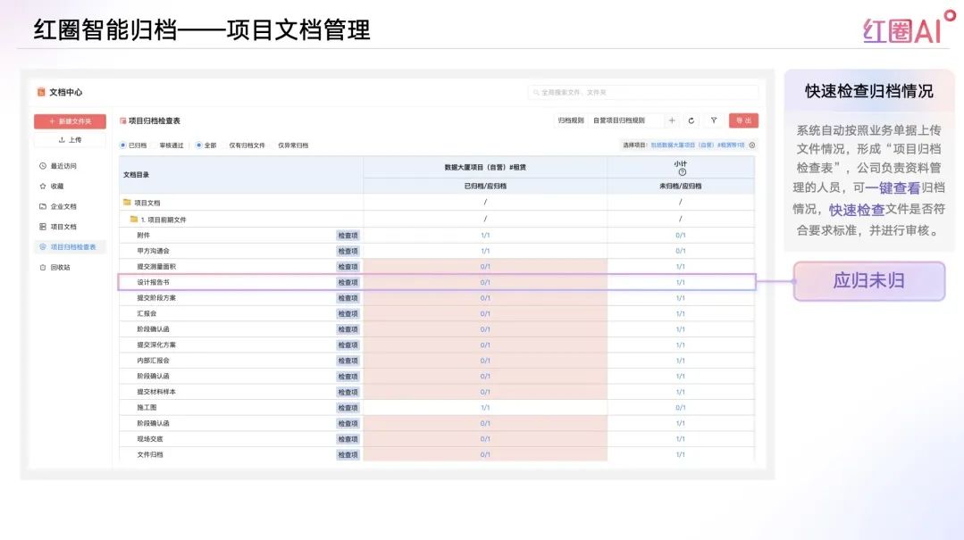 系統自動按照業務單據上傳文件情況,形成“項目歸檔檢查表”,公司負責資料管理的人員,可一鍵查看歸檔情況,包括“應歸未歸”、“應歸已歸”、“已歸未審核通過”等。