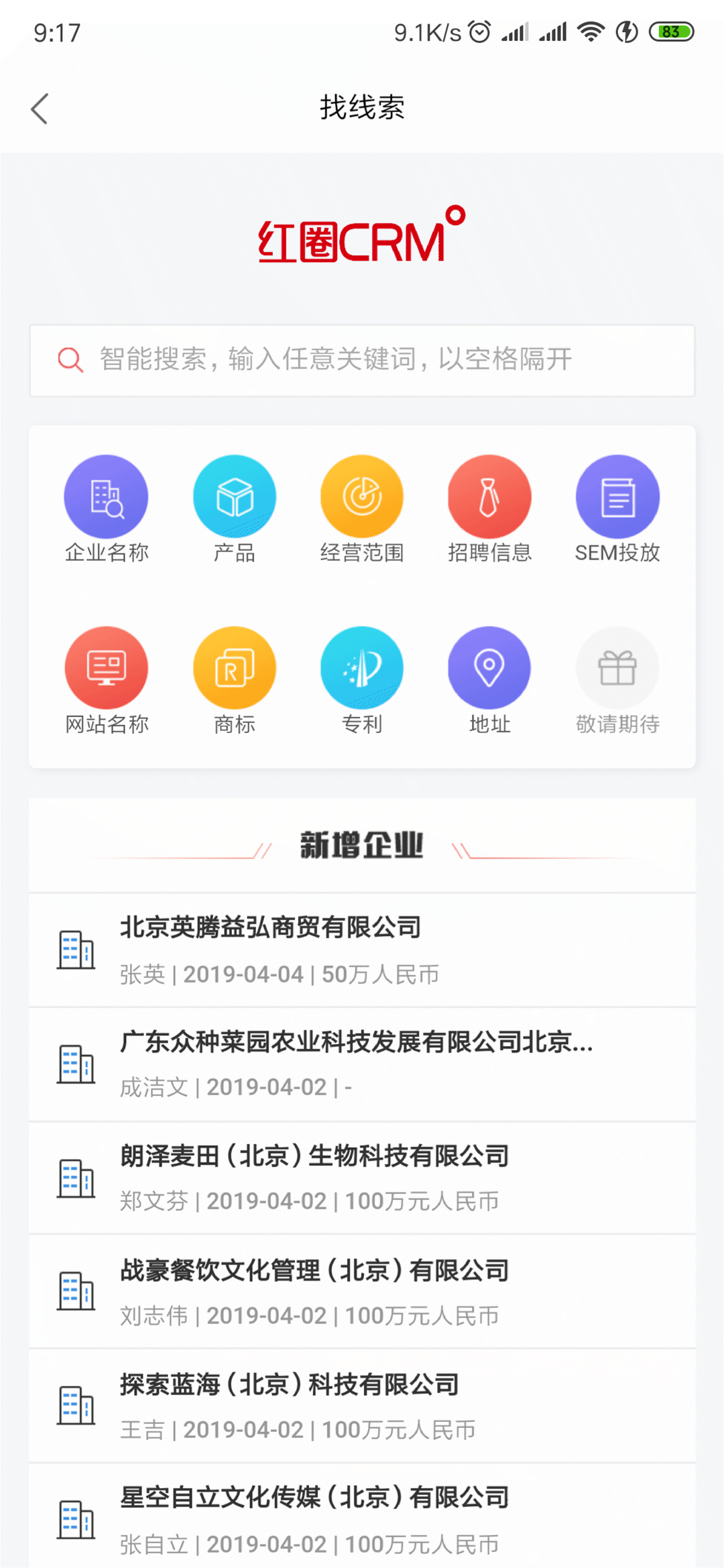 紅圈CRM V1094版本將為企業解決獲客渠道單?、線索來源不穩定的難題,從源頭出發,助力企業業績提升。銷售人員在“找線索”頁面輸入關鍵詞(如企業名稱、產品、地址、招聘信息等)后,系統能夠基于全網大數據信息采集,從海量數據中精準、快速地篩選出符合客戶畫像的優質資源,銷售人員能夠獲取企業完整信息以及相關聯系人、電話等精準信息,并可?鍵轉為銷售線索,將重要信息保存到系統中。