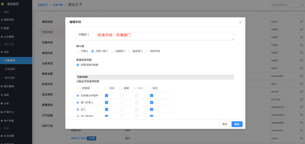 - 系統字段及按鈕修改權限配置:系統字段、標準字段(所屬部門及負責人)、按鈕支持在編輯時修改權限