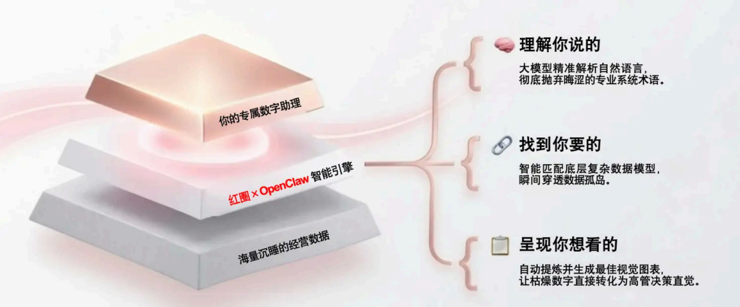 BOSS助理接入OpenClaw,標(biāo)志著紅圈工程在"AI+企業(yè)管理"領(lǐng)域邁出了關(guān)鍵一步。這不是簡單的接口開放,而是軟件能力與AI智能的深度融合: