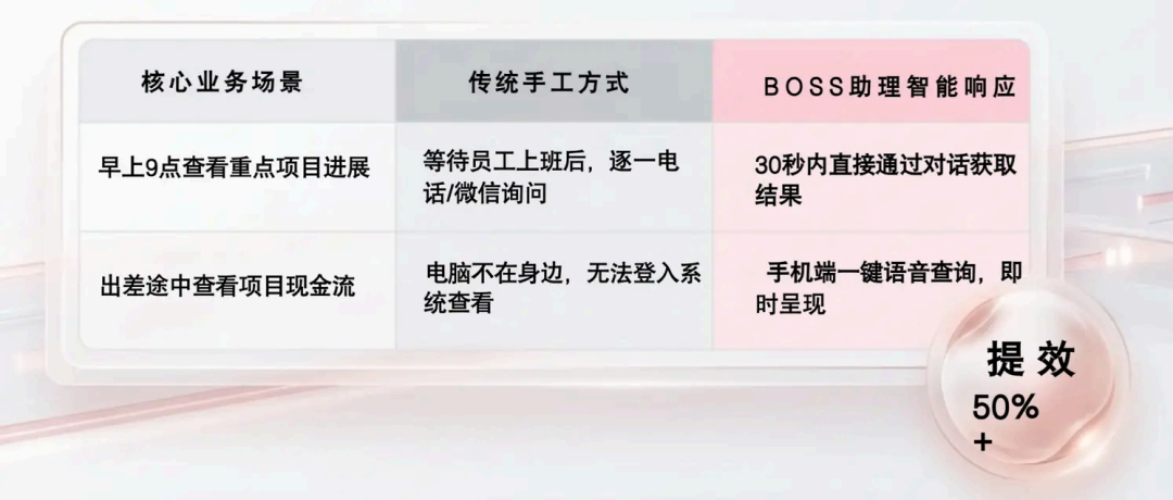 BOSS助理以"智能匯報、精準(zhǔn)呈現(xiàn)、數(shù)據(jù)安全"三大核心優(yōu)勢為支撐,通過AI意圖深度識別與數(shù)據(jù)分析模型,實現(xiàn)了數(shù)據(jù)獲取的革命性突破: