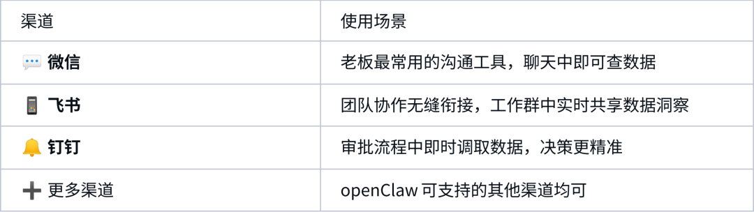 這意味著什么?意味著管理者無需打開復(fù)雜的系統(tǒng)界面,無需學(xué)習(xí)繁瑣的操作流程,只需通過微信、飛書、釘釘?shù)热粘贤üぞ撸窳奶煲粯幼匀坏靥岢鰡栴},就能即時獲取關(guān)鍵經(jīng)營數(shù)據(jù)。
