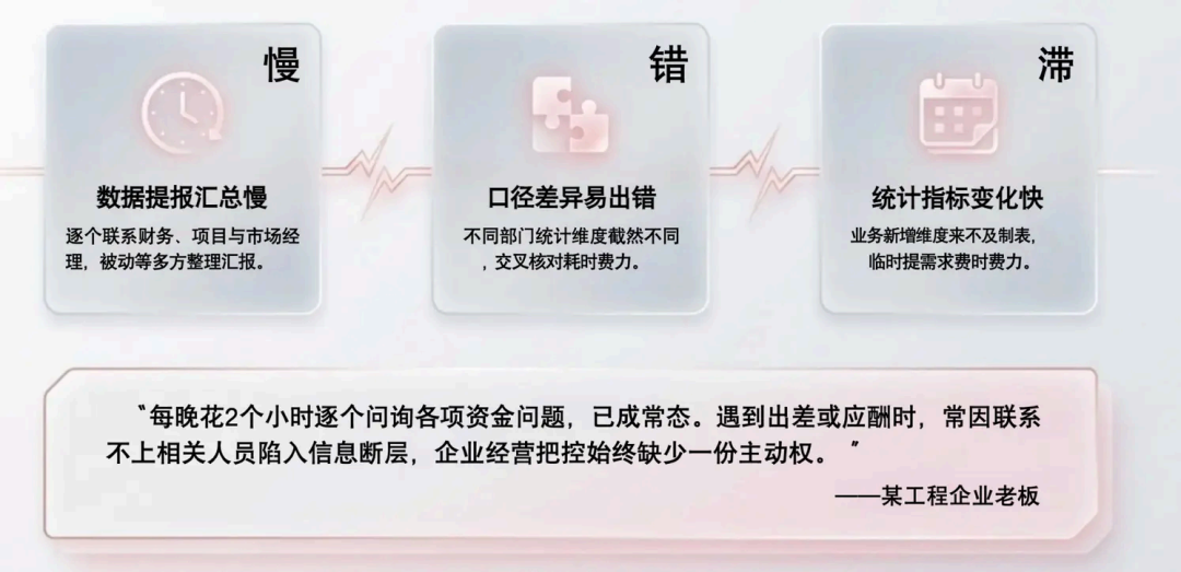 工程企業(yè)管理者每天都要面對大量的數(shù)據(jù)需求:賬戶余額、應(yīng)收應(yīng)付、項目進(jìn)度、市場報備……但在傳統(tǒng)模式下,獲取這些數(shù)據(jù)卻面臨重重阻礙: