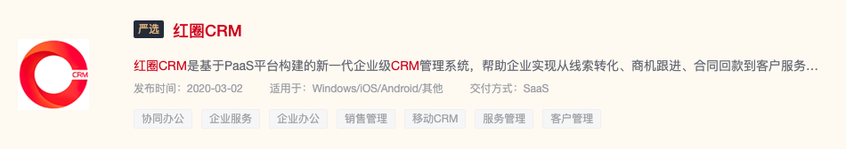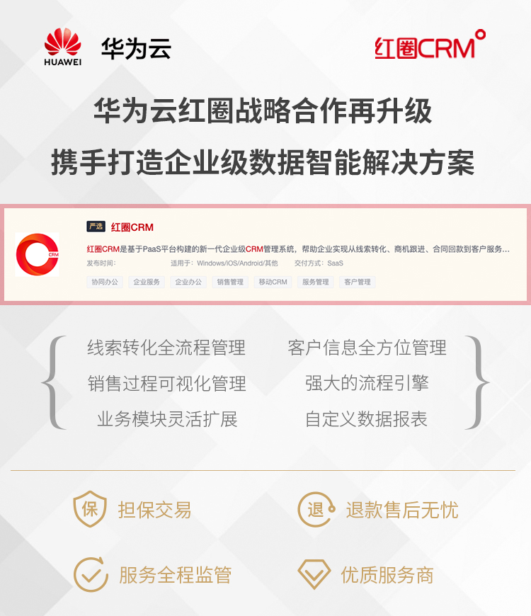 日前,繼2019年作為首批加入華為云WeLink的生態伙伴和唯一CRM系統服務商后,紅圈與華為云戰略合作持續升級,再次在華為云嚴選商城發布了紅圈 CRM企業級移動銷售自動化管理系統。旨在基于華為云整體公有云解決方案的基礎上,為中大型企業、集團公司用戶提供更加優質的數據智能解決方案,幫助企業實現從線索轉化、商機跟進、合同回款到客戶服務的LTC全流程精細化管理,提升企業競爭力,推動企業業績增長。