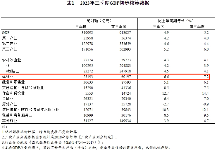 10月18日,國家統計局發布2023年三季度國民經濟相關數據。初步核算,前三季度國內生產總值913027億元,按不變價格計算,同比增長5.2%。建筑業第三季度總產值23193億元,前三季度60197億元。