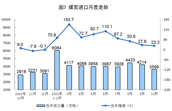 原煤生產(chǎn)增速加快,進(jìn)口較快增長(zhǎng)。10月份,生產(chǎn)原煤3.9億噸,同比增長(zhǎng)3.8%,增速比9月份加快3.4個(gè)百分點(diǎn),日均產(chǎn)量1254.0萬噸。進(jìn)口煤炭3599萬噸,同比增長(zhǎng)23.3%,增速比9月份回落4.5個(gè)百分點(diǎn)。