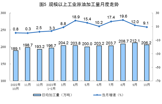 原油加工保持穩(wěn)定增長(zhǎng)。10月份,加工原油6393萬噸,同比增長(zhǎng)9.1%,增速比9月份放緩2.9個(gè)百分點(diǎn),日均加工原油206.2萬噸。1—10月份,加工原油61876萬噸,同比增長(zhǎng)11.2%。