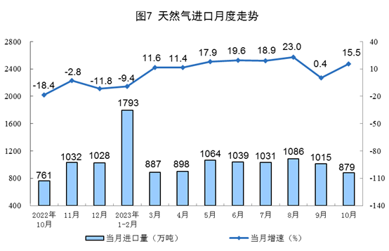 1—10月份,生產(chǎn)天然氣1896億立方米,同比增長(zhǎng)6.1%。進(jìn)口天然氣9651萬噸,同比增長(zhǎng)8.8%。
