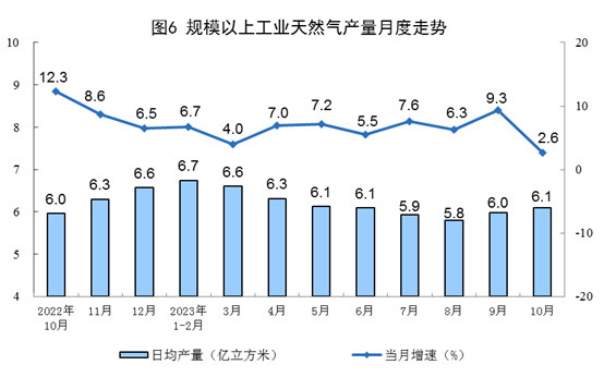 天然氣生產(chǎn)保持平穩(wěn),進(jìn)口增速加快。10月份,生產(chǎn)天然氣190億立方米,同比增長(zhǎng)2.6%,增速比9月份回落6.7個(gè)百分點(diǎn),日均產(chǎn)量6.1億立方米。進(jìn)口天然氣879萬噸,同比增長(zhǎng)15.5%,增速比9月份加快15.1個(gè)百分點(diǎn)。