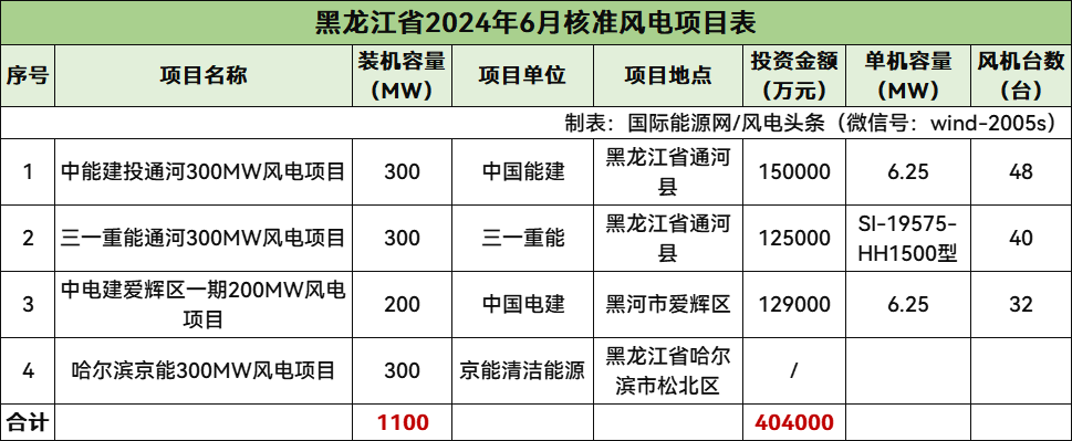 黑龍江核準4個風電項目,總規模1100MW,總投資404000萬元,均為陸上風電項目。
