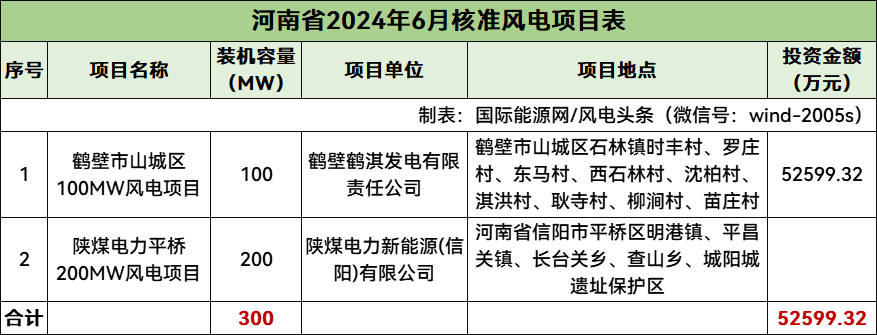 河南核準2個風電項目,總規模300MW,總投資52599.32萬元,均為陸上風電項目。