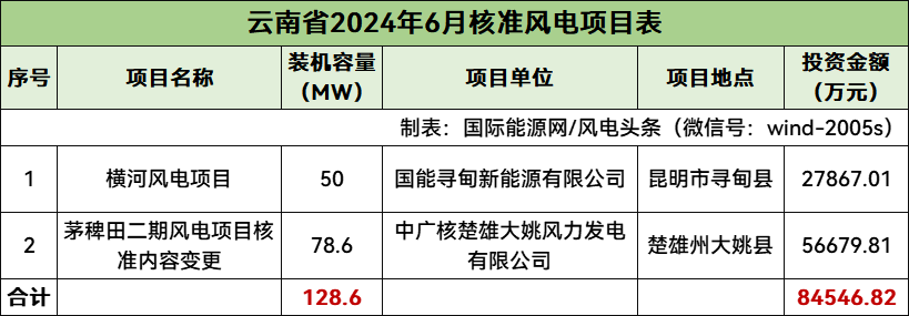 云南核準2個風電項目,總規模128.6MW,總投資84546.82萬元,均為陸上風電項目。