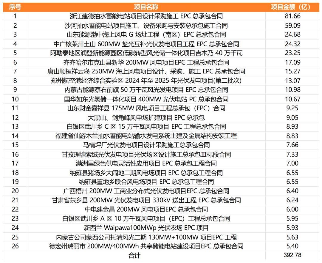 其中,涉及風(fēng)電、光伏、儲(chǔ)能與抽水蓄能等項(xiàng)目共計(jì)26個(gè),涉及金額392.78億。