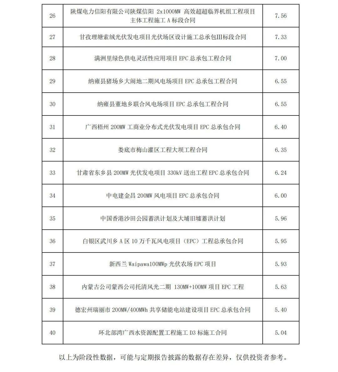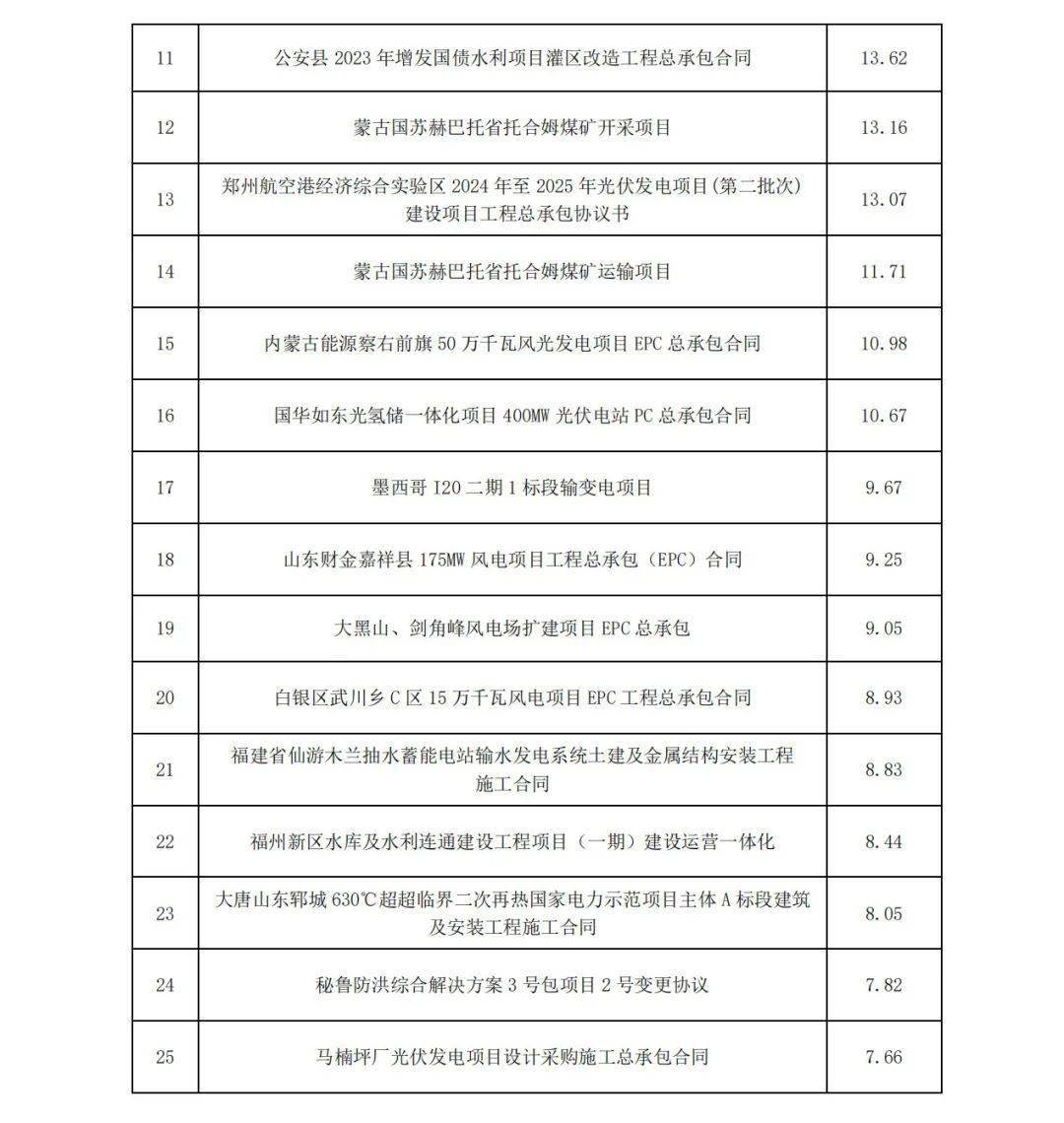 12月20日,中國(guó)電建發(fā)布《 中國(guó)電力建設(shè)股份有限公司2024年1月至11月主要經(jīng)營(yíng)情況公告》,披露了2024年1-11月,2024年11月,公司新簽合同金額在人民幣5億元以上的單體項(xiàng)目共有40個(gè)。