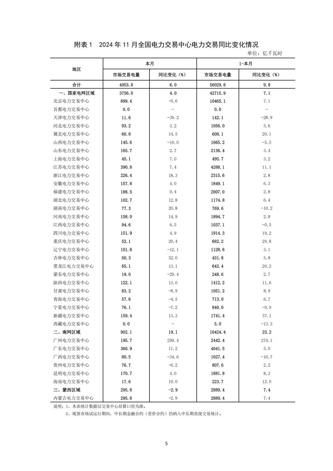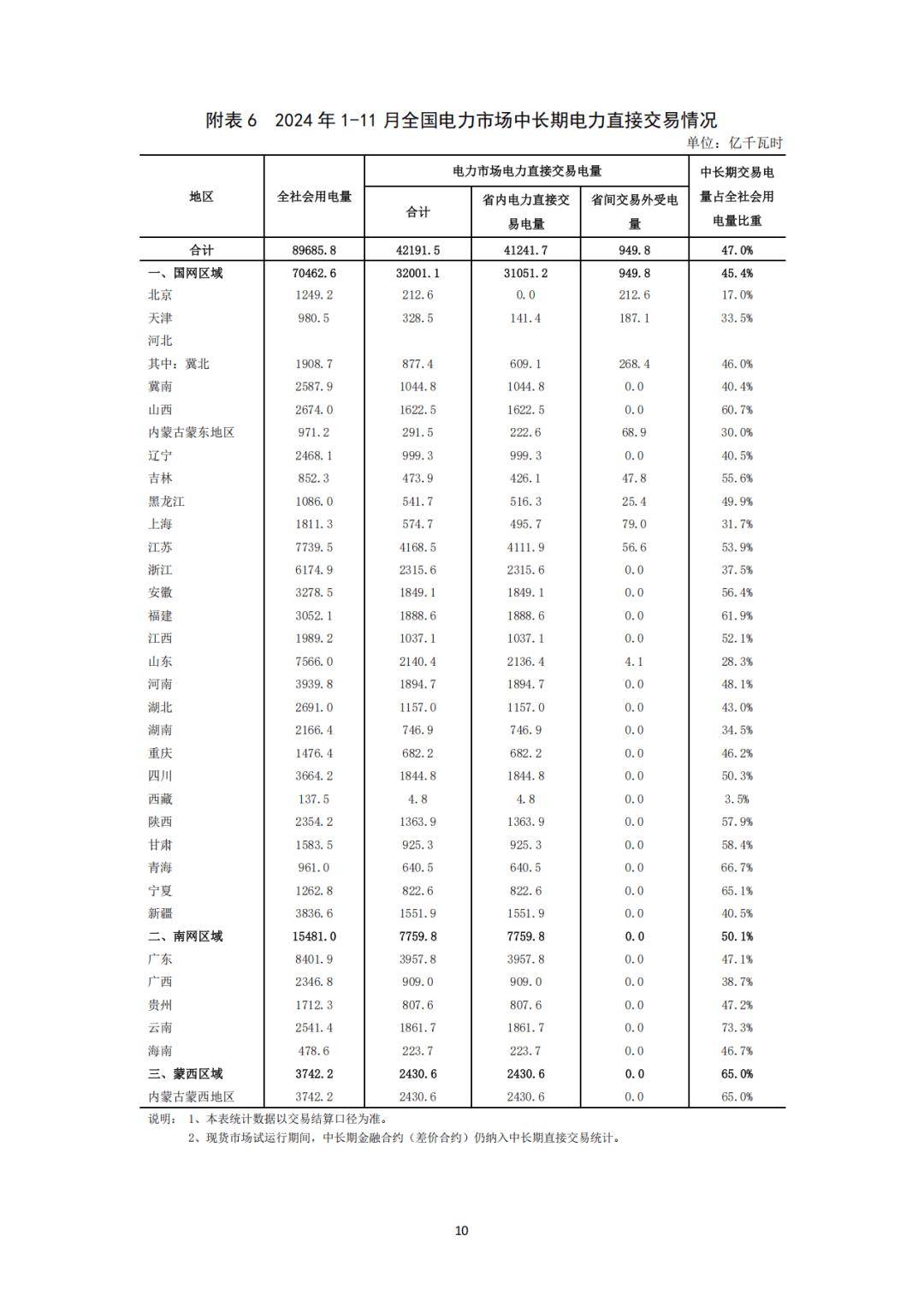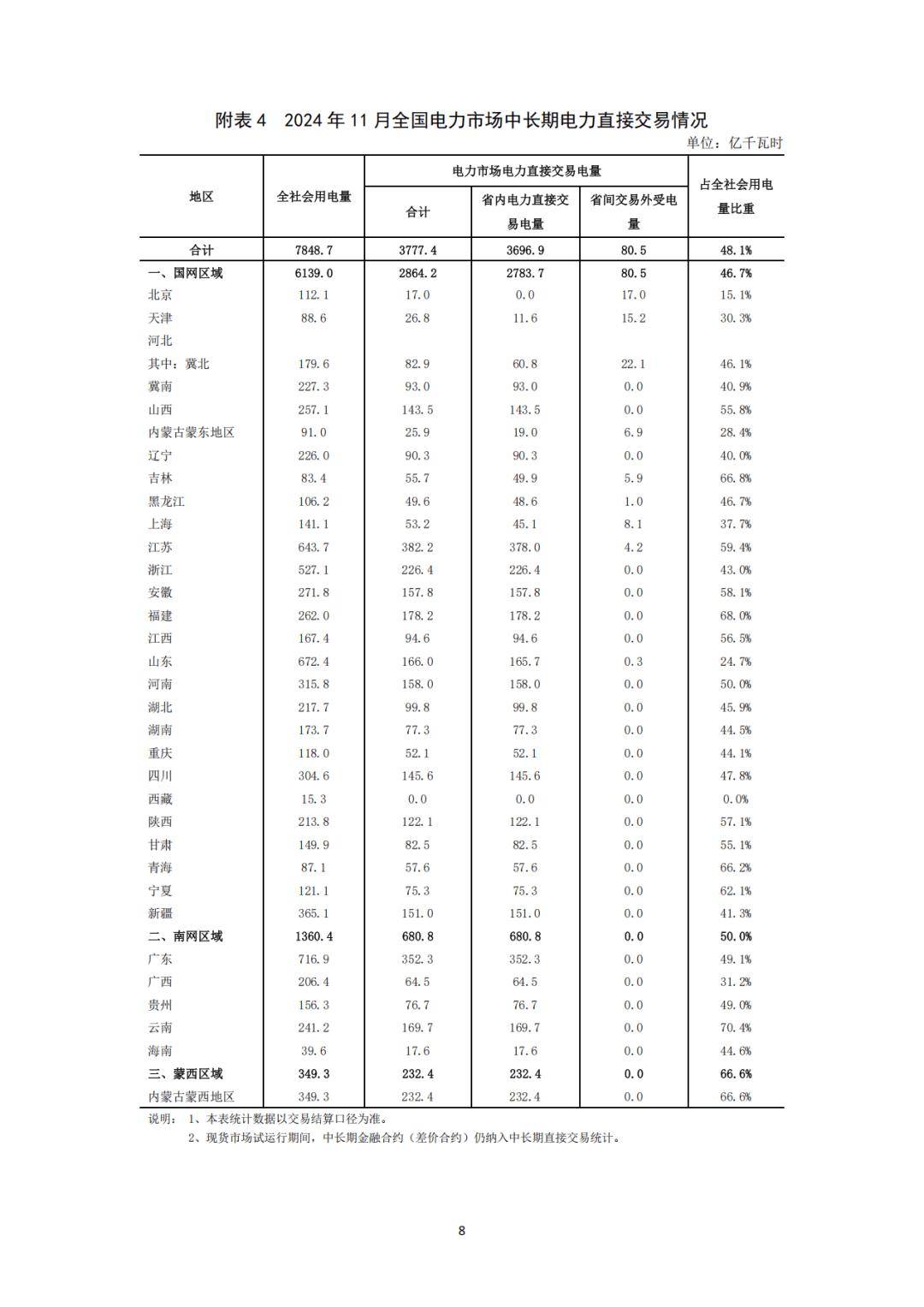 分區域看,1-11月,國家電網區域中長期電力直接交易電量合計為32001.1億千瓦時,同比增長5.4%;南方電網區域中長期電力直接交易電量合計為7759.8億千瓦時,同比增長5.2%;蒙西電網區域中長期電力直接交易電量合計為2430.6億千瓦時,同比增長11.1%。