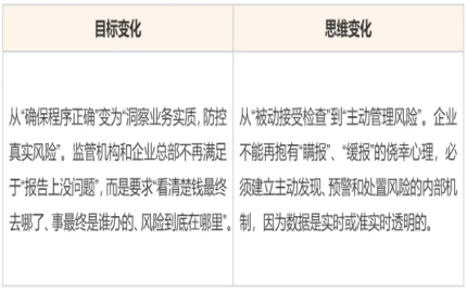 從目標與思維看,過去監(jiān)管更關注“程序正確”,企業(yè)也常抱有“被動接受檢查”的心態(tài);如今則轉向“洞察業(yè)務實質、防控真實風險”——監(jiān)管機構與企業(yè)總部不僅要“報告沒問題”,更要“看清錢去哪、事誰辦、風險在哪”,企業(yè)也必須建立主動發(fā)現(xiàn)、預警、處置風險的機制,畢竟數(shù)據(jù)已實現(xiàn)實時或準實時透明。