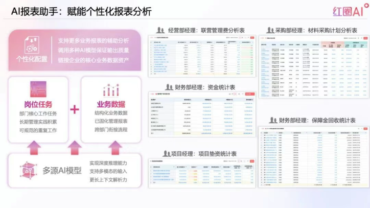 過去,財(cái)務(wù)、經(jīng)營(yíng)、項(xiàng)目等部門要花幾天時(shí)間做報(bào)表,結(jié)果還只是 “數(shù)據(jù)的堆砌”;現(xiàn)在,AI 報(bào)表助手能自動(dòng)生成多維度管理報(bào)表,比如材料采購(gòu)計(jì)劃分析、項(xiàng)目墊資統(tǒng)計(jì)、聯(lián)營(yíng)管理費(fèi)分析等,還能自定義配置報(bào)表維度,滿足不同崗位的需求。更進(jìn)階的是 “項(xiàng)目 360°AI 解讀”:系統(tǒng)會(huì)綜合項(xiàng)目的進(jìn)度、成本、質(zhì)量、安全數(shù)據(jù),自動(dòng)對(duì)比目標(biāo)與實(shí)際的差異 —— 比如發(fā)現(xiàn)某項(xiàng)目成本超支,會(huì)精準(zhǔn)定位是 “材料價(jià)格上漲” 還是 “用量超標(biāo)”;還能預(yù)警潛在風(fēng)險(xiǎn),比如 “某項(xiàng)目進(jìn)度滯后可能影響現(xiàn)金流”,并給出調(diào)整建議。