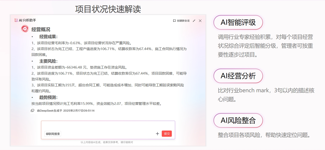 紅圈推出的紅圈AI系列產(chǎn)品中的項目360°AI解讀,能把項目上的資金、成本、合同、付款這些數(shù)據(jù)全都整合在一起,一鍵生成一張項目全景作戰(zhàn)圖。